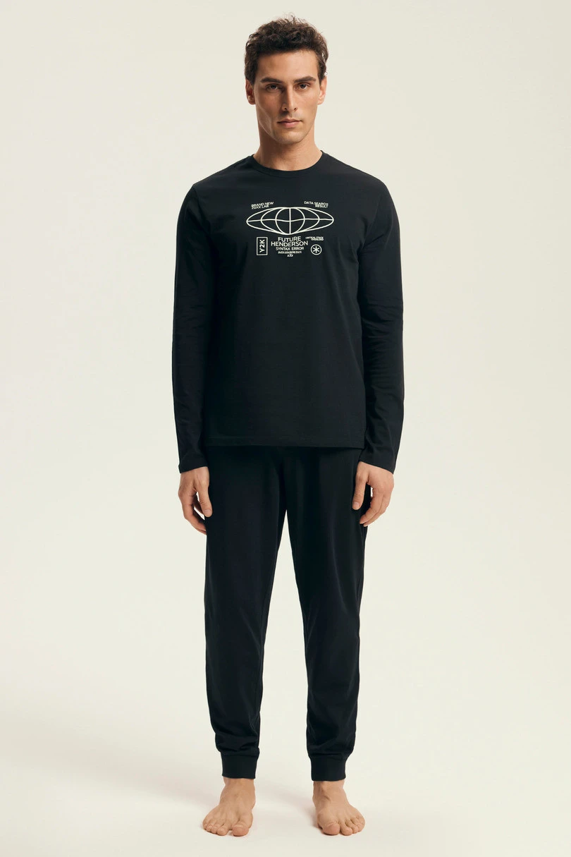 Přeneste se do budoucnosti s moderním pánským pyžamem LOGER 43469 AW25 od značky Henderson. Černá kombinace a futuristický potisk na košili vytvářejí jedinečnou vesmírnou atmosféru. Pyžamo je vyrobeno ze 100% kvalitní prodyšné bavlny, která zaručuje pohodlný spánek a příjemně se nosí. Kalhoty s žebrovanými lemy a elastickým pasem s natištěným logem "Future Henderson" zaručují dokonalé padnutí. Ideální pro muže, kteří ocení originální styl a každodenní funkčnost.