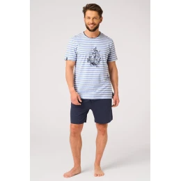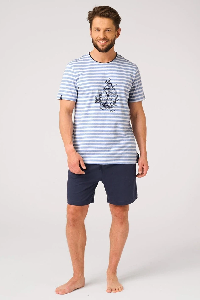 Stylové a pohodlné pánské pyžamo ideální pro jarně-letní sezónu. Vrchní díl v klasickém modrobílém pruhu byl ve střední části ozdoben jemným námořnickým potiskem, který celku dodává sváteční charakter. Tričko s krátkým rukávem a kulatým výstřihem zajišťuje volnost pohybu a pohodlí při nošení.