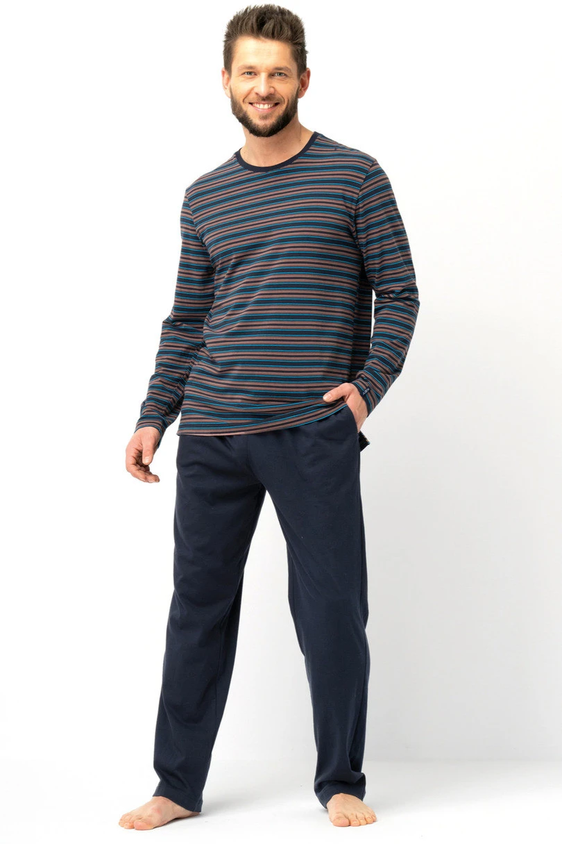 Piżama męska MNS 315 to połączenie komfortu i elegancji w domowym wydaniu. Górna część to miękka, przewiewna koszulka z długim rękawem, ozdobiona modnym, poziomym wzorem w paski w odcieniach granatu, bordo i błękitu. Luźny krój zapewnia swobodę ruchów, a miękki materiał delikatnie otula ciało. Spodnie w jednolitym granatowym kolorze, wykonane z przyjemnej w dotyku dzianiny, posiadają prostą nogawkę, dzięki czemu leżą wygodnie i nie krępują ruchów podczas snu. Całość doskonale sprawdzi się zarówno jako strój nocny, jak i wygodny ubiór domowy.