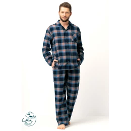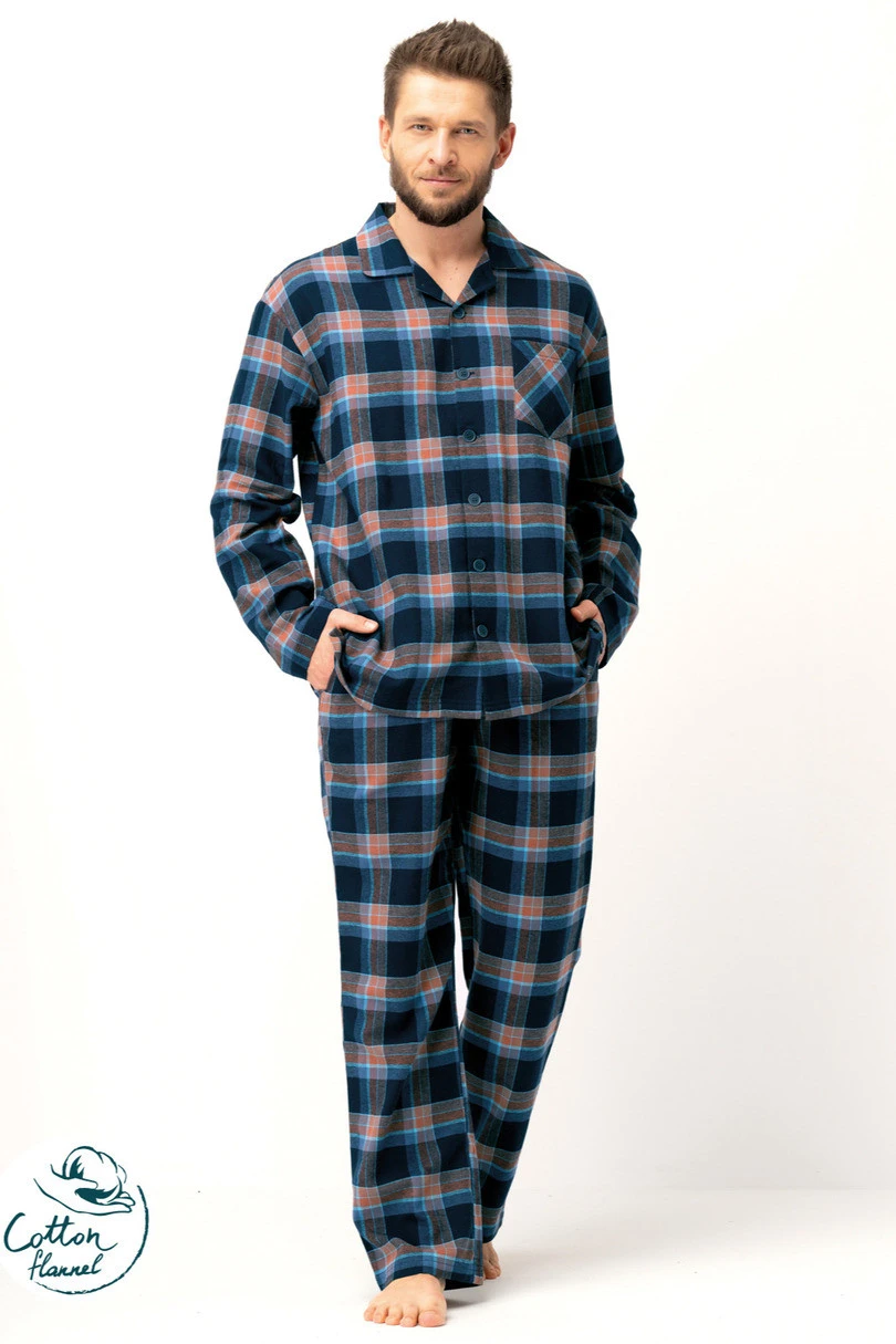 Piżama męska MNS 431 to klasyczny komplet z miękkiej, oddychającej flaneli bawełnianej, idealny na chłodniejsze noce. Koszula zapinana na guziki z kołnierzykiem i praktyczną kieszonką na piersi, spodnie o luźnym kroju z elastyczną talią zapewniają swobodę ruchów i komfort noszenia. Modny, ponadczasowy wzór w granatowo-niebieską kratę z akcentami w odcieniach brązu nadaje jej eleganckiego charakteru. Doskonały wybór dla mężczyzn ceniących klasyczny styl i wygodę w domowym zaciszu.