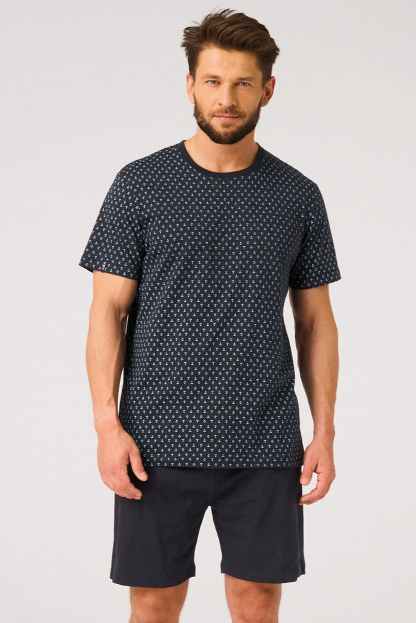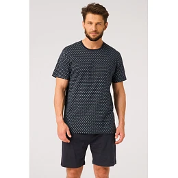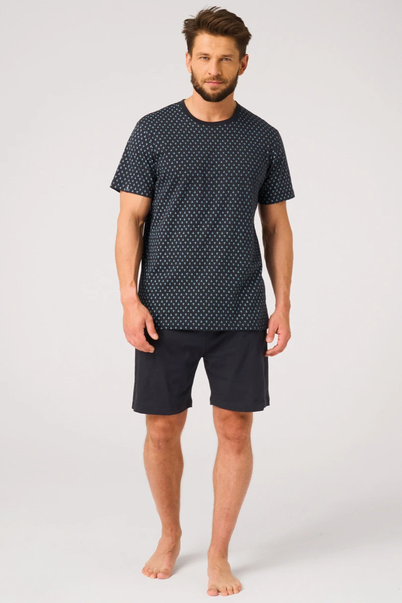 Pánská pyžamová souprava je dokonalou kombinací pohodlí a klasického stylu. Souprava se skládá z trička s krátkým rukávem a krátkých šortek v jednoduchém, volném střihu. Kvalitní, měkká pletenina je příjemná k pokožce a poskytuje pohodlí po celou noc i při domácím odpočinku.
