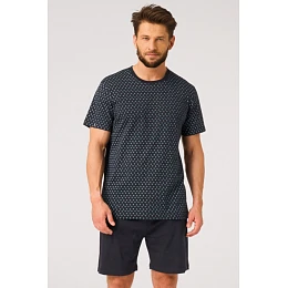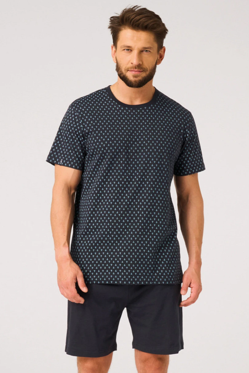 Pánská pyžamová souprava je dokonalou kombinací pohodlí a klasického stylu. Souprava se skládá z trička s krátkým rukávem a krátkých šortek v jednoduchém, volném střihu. Kvalitní, měkká pletenina je příjemná k pokožce a poskytuje pohodlí po celou noc i při domácím odpočinku.