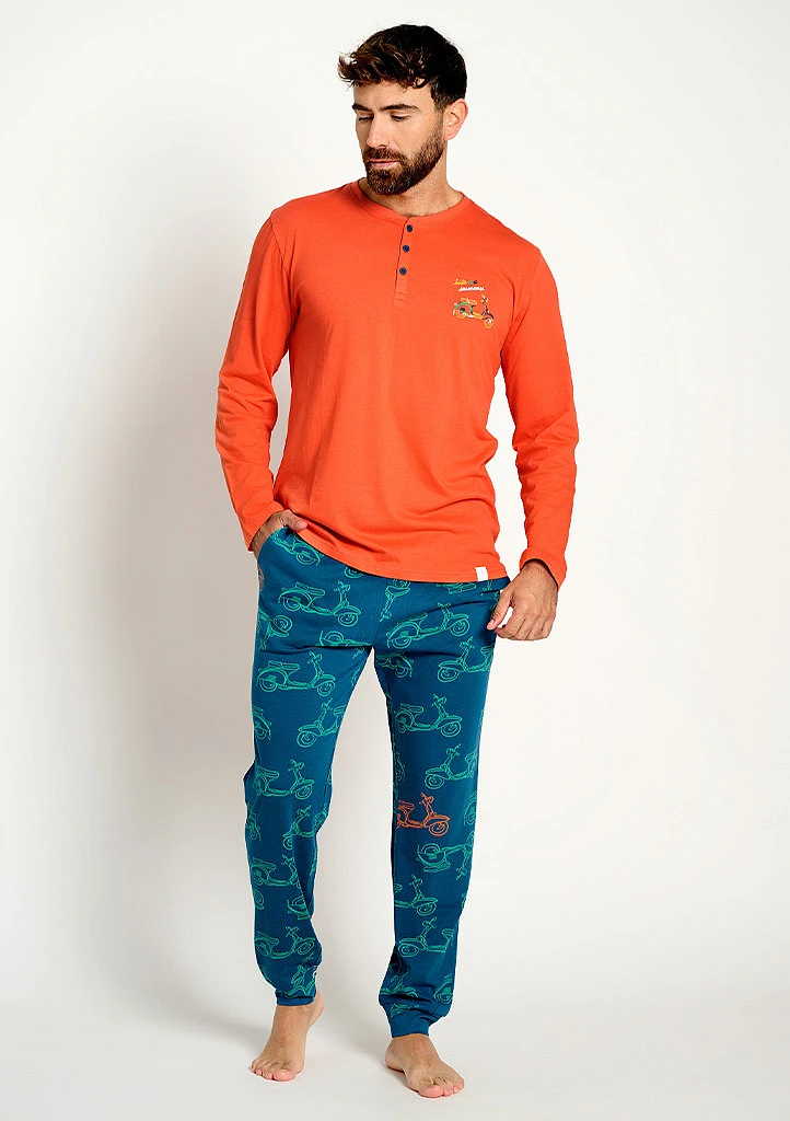 Pánské pyžamo značky Muydemi v moderním a výrazném designu tvoří tričko s dlouhým rukávem v syté oranžové barvě doplněné o dlouhé kalhoty s potiskem. Tričko má kulatý výstřih s krátkou légou na knoflíčky a je doplněno drobným motivem skútru na hrudi, který ladí s celkovým stylem setu. Kalhoty mají pohodlný střih, elastický pas a jsou zdobeny opakujícím se vzorem skútrů v kontrastních barvách, díky čemuž působí hravě a originálně. Příjemný a lehký materiál zajišťuje maximální komfort při spánku i domácím nošení, ideální i pro chladnější večery.