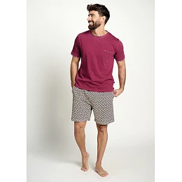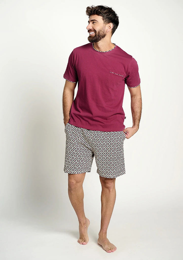 Pánské pyžamo značky Muydemi v elegantním a zároveň pohodlném stylu tvoří tričko s krátkým rukávem v vínovém odstínu doplněné o kraťasy s jemným geometrickým vzorem. Tričko má kulatý výstřih a je ozvláštněno kontrastním lemem u výstřihu, rukávů i náprsní kapsy, která dodává modelu zajímavý detail. Kraťasy mají pohodlný střih, elastický pas a díky vzorovanému designu působí stylově a moderně. Lehký a příjemný materiál zajišťuje maximální komfort při spánku i domácím nošení během teplejších nocí.