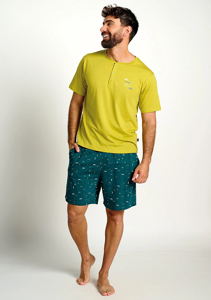 Pánské pyžamo značky Muydemi v moderním a svěžím designu tvoří pohodlné tričko s krátkým rukávem ve výrazném žlutozeleném odstínu doplněné o kraťasy v tmavě zelené barvě s jemným potiskem. Tričko má kulatý výstřih s krátkou légou na knoflíčky, působí ležérně a zároveň stylově. Kraťasy mají pohodlný střih, elastický pas a jsou ideální pro maximální komfort při spánku i domácím nošení. Příjemný a lehký materiál zajišťuje pohodlí během teplejších nocí, zatímco moderní barevná kombinace dodává celému setu atraktivní vzhled.