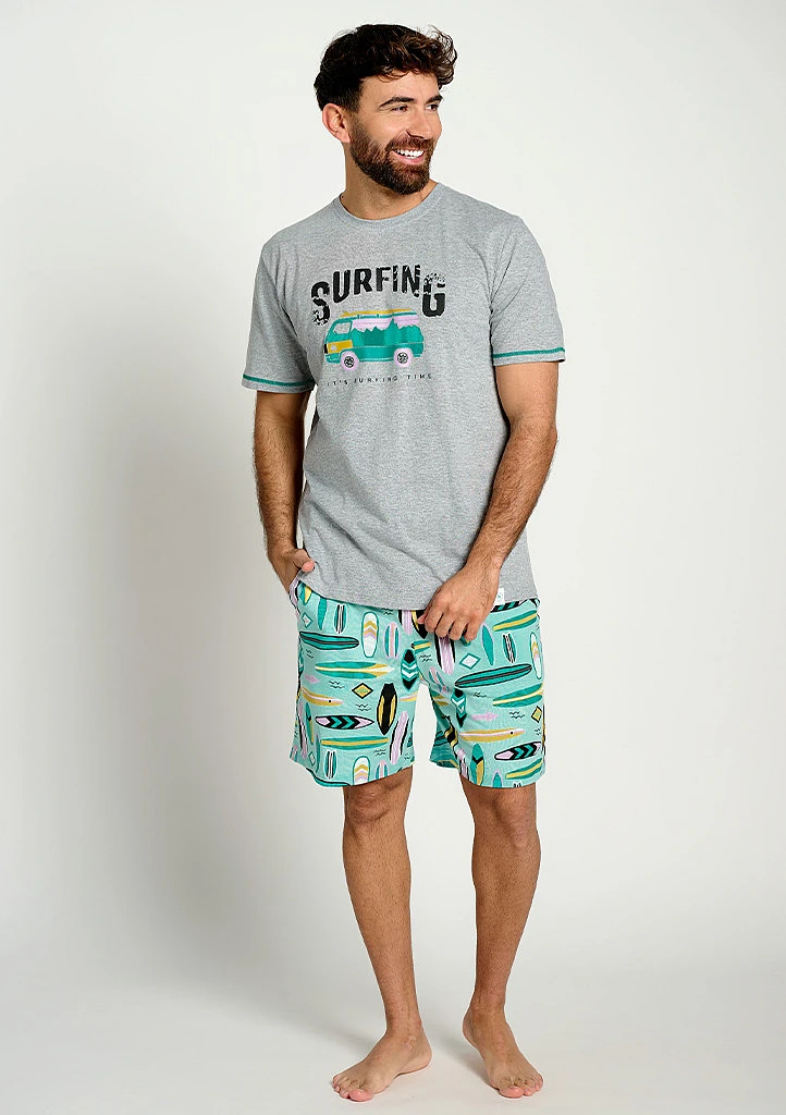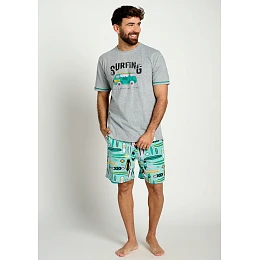 Pánské pyžamo značky Muydemi v hravém letním stylu tvoří šedé tričko s krátkým rukávem doplněné o kraťasy s barevným surfovým motivem. Tričko má kulatý výstřih a je ozdobeno potiskem s nápisem „Surfing“ a motivem dodávky, který podtrhuje uvolněnou prázdninovou atmosféru, rukávy jsou navíc zakončeny kontrastním lemem. Kraťasy mají pohodlný střih, elastický pas a výrazný vícebarevný potisk inspirovaný surfy, který dodává celému setu svěží a moderní vzhled. Příjemný a lehký materiál zajišťuje maximální komfort při spánku i domácím nošení během teplejších dnů.