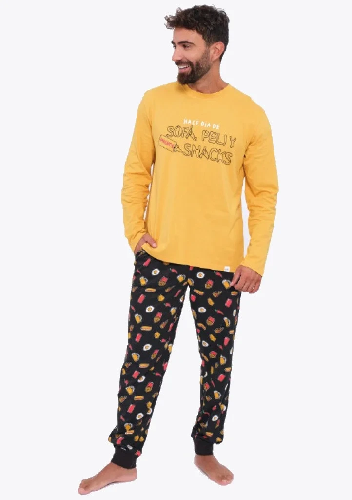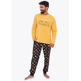 Pánské pyžamo španělské značky Muydemi. Tričko má dlouhý rukáv a na přední straně je natištěná aplikace. Rukávy jsou ukončené volně. Kalhoty jsou v pase do pružné pohodlné gumy ve které je provlečená šňůrka pro případné utáhnutí. Spodní část nohavic je ukončená lemem.