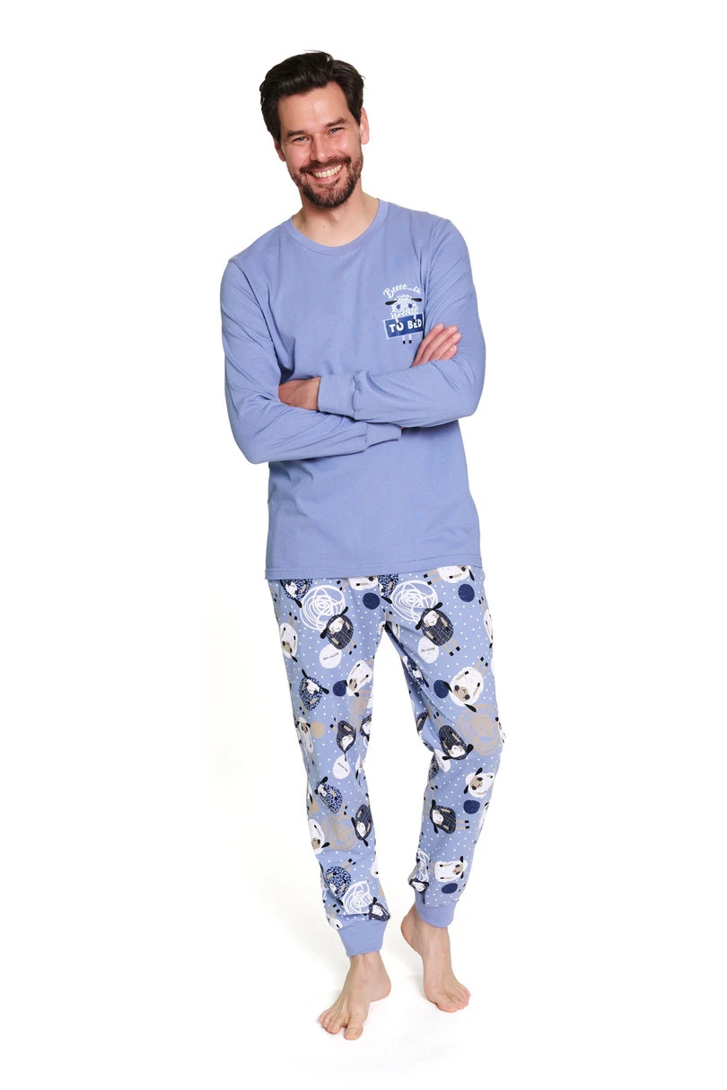 PMB.7347 značky Doctor Nap je pánský pyžamový komplet kombinující pohodlí a moderní design. Je vyroben ze 100% přírodní, prodyšné bavlny, která zaručuje měkkost, prodyšnost a pohodlí během spánku i doma. Komplet se skládá z modrého trička s dlouhým rukávem a originálním potiskem, který dodává celému kompletu lehký, ležérní charakter. Kalhoty rovného střihu, vybavené praktickými kapsami a zakončené v pase šňůrkou, zajišťují volnost pohybu a perfektně padnou. Jedná se o skvělou volbu pro muže, kteří ocení pohodlí a přírodní materiál příjemný na dotek.