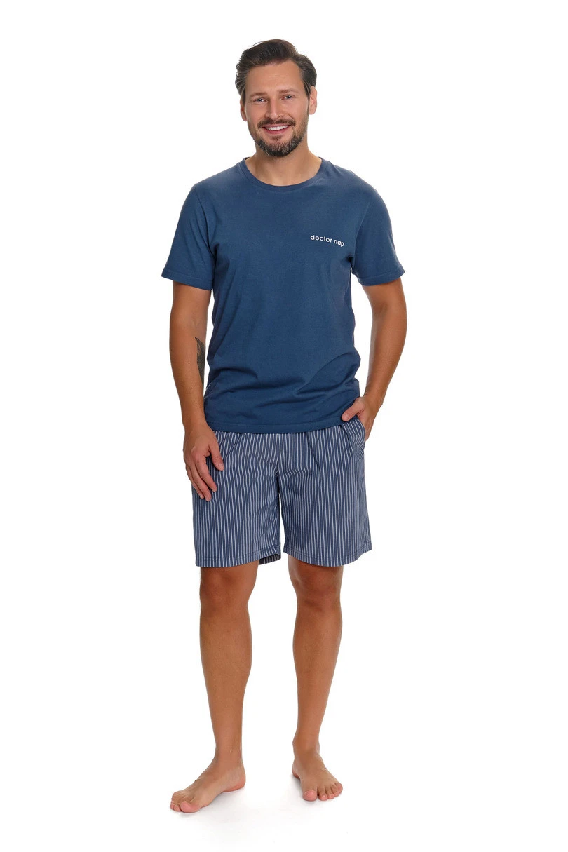 Piżama męska PMB.7424 BIG DR NAP w kolorze Denim Blue to klasyczny, ponadczasowy komplet stworzony z myślą o komforcie snu i domowego wypoczynku. Wykonana z wysokogatunkowej dzianiny (71% bawełna, 26% poliester, 3% elastan), jest miękka, przyjemna dla skóry i zapewnia wygodę przez całą noc. Gładki T-shirt w odcieniu denim blue z subtelnym logo Doctor Nap na piersi posiada swobodny, komfortowy krój. Spodenki w delikatne paseczki nadają całości lekko sportowego charakteru. Ozdobna guma w pasie z logo marki gwarantuje idealne dopasowanie i nowoczesny wygląd, a praktyczne kieszonki po bokach zwiększają funkcjonalność zestawu. Piżama została starannie uszyta w Polsce z dbałością o każdy detal. Model dostępny również w wersji damskiej – idealny do stworzenia rodzinnego kompletu.
