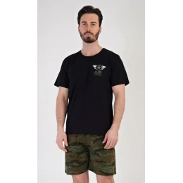 Pánské bavlněné pyžamo šortky Air. Pánské pyžamo se skládá z trička s krátkým rukávem a šortkových kalhot. Černé tričko s kulatým výstřihem zdobí menší nápis. Šortky s army potiskem mají v pase gumu a šňůrku na stažení. Krátké šortkové kalhoty nemají kapsy. Použitý materiál s obsahem bavlny 100% je příjemný a poddajný na dotek.