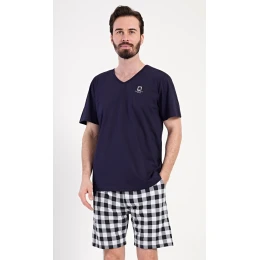 Pánské bavlněné šortkové pyžamo Alfréd. Pánské pyžamo se skládá z trička s krátkým rukávem a krátkých šortkových kalhot. Tričko s výstřihem do V zdobí na hrudi malé logo a nápis GENTLEMAN CLUB. Tričko doplňují kárované šortky, které mají v pase gumu, šňůrku na stažení a praktické kapsy. Použitý materiál s obsahem bavlny 100% je příjemný a poddajný na dotek.