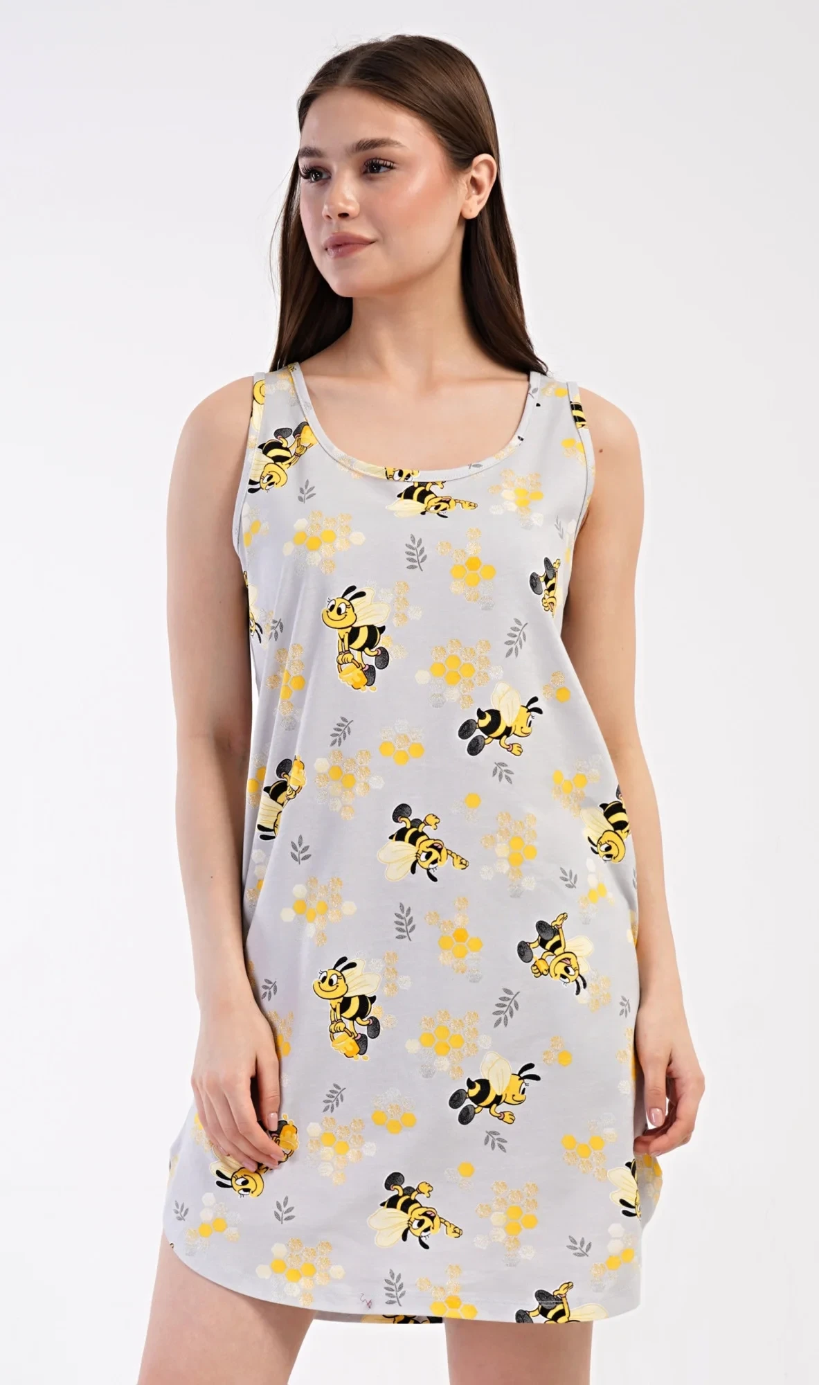 Dámská bavlněná noční košile na ramínka Včelky. Noční košile se širšími ramínky a kulatým výstřihem má praktické kapsy, je potištěna obrázky včelek. Použitý materiál s obsahem bavlny 100% je příjemný a poddajný na dotek. Košile je vhodná i na denní nošení, obvzlášť ji oceníte v horkých letních dnech.
