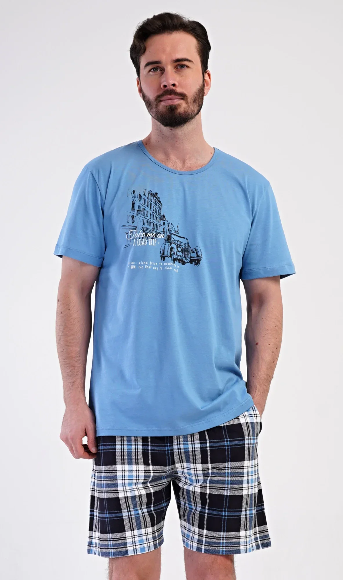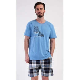 Pánské bavlněné šortkové pyžamo Felix. Pánské pyžamo se skládá z trička s krátkým rukávem a krátkých šortkových kalhot. Tričko s kulatým výstřihem zdobí na hrudi obrázek historického auta. Tričko doplňují kárované šortky, které mají v pase gumu, šňůrku na stažení a praktické kapsy. Použitý materiál s obsahem bavlny 100% je příjemný a poddajný na dotek.