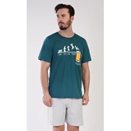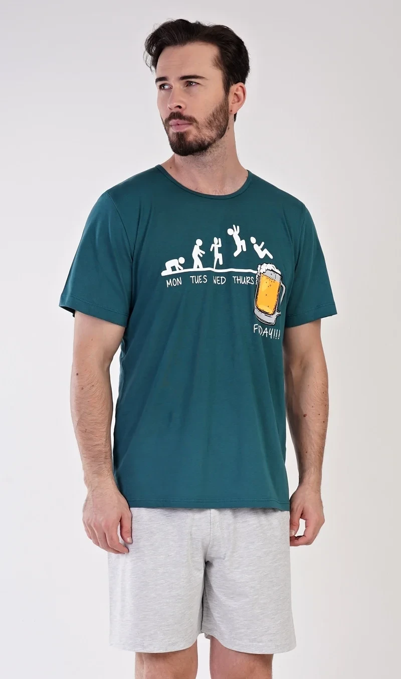 Pánské pyžamo šortky Filip. Pánské pyžamo se skládá z trička s krátkým rukávem a krátkých šortkových kalhot. Jednobarevné tričko s kulatým výstřihem je zdobeno veselým obrázkem panáčků, kteří se s blížícím víkendem nemůžou dočkat sklenice piva. Tričko doplňují jednobarevné šortky, které mají v pase gumu a šňůrku ke stažení. Nemají kapsy. Použitý materiál je příjemný a poddajný na dotek. Podíl bavlny u trička je 100% a šortek 70%. Pyžamo je vhodné i na denní nošení.