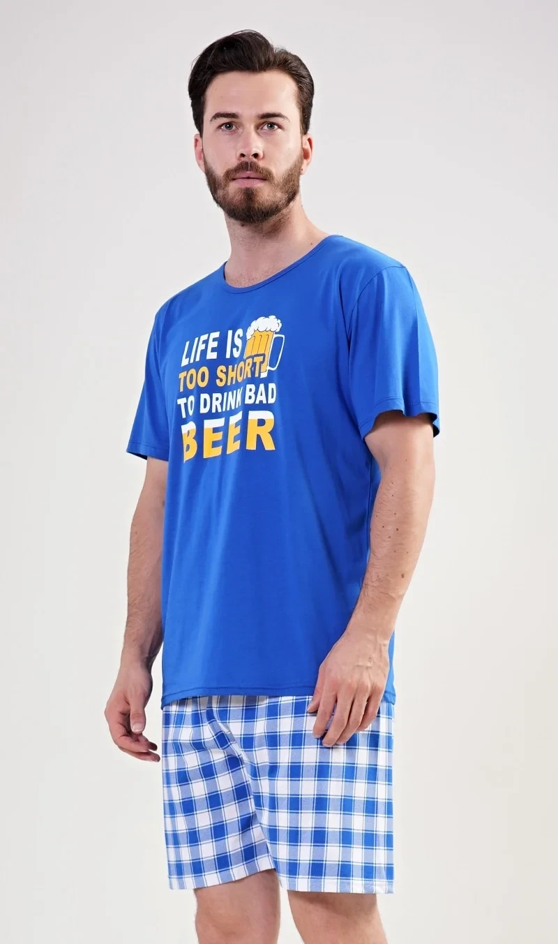 Pánské bavlněné pyžamo šotky Life is beer. Pánské pyžamo se skládá z trička s krátkým rukávem a krátkých šortkových kalhot. Na tričku je nápis Life is too short to drink bad beer. Výrazné tričko vhodně doplňují kostkované kalhoty. Šortky jsou bez kapes, mají gumu a šňůrku na stažení. Použitý materiál s podílem bavlny 100% je příjemný a poddajný na dotek. Pyžamo je vhodné i na denní nošení.