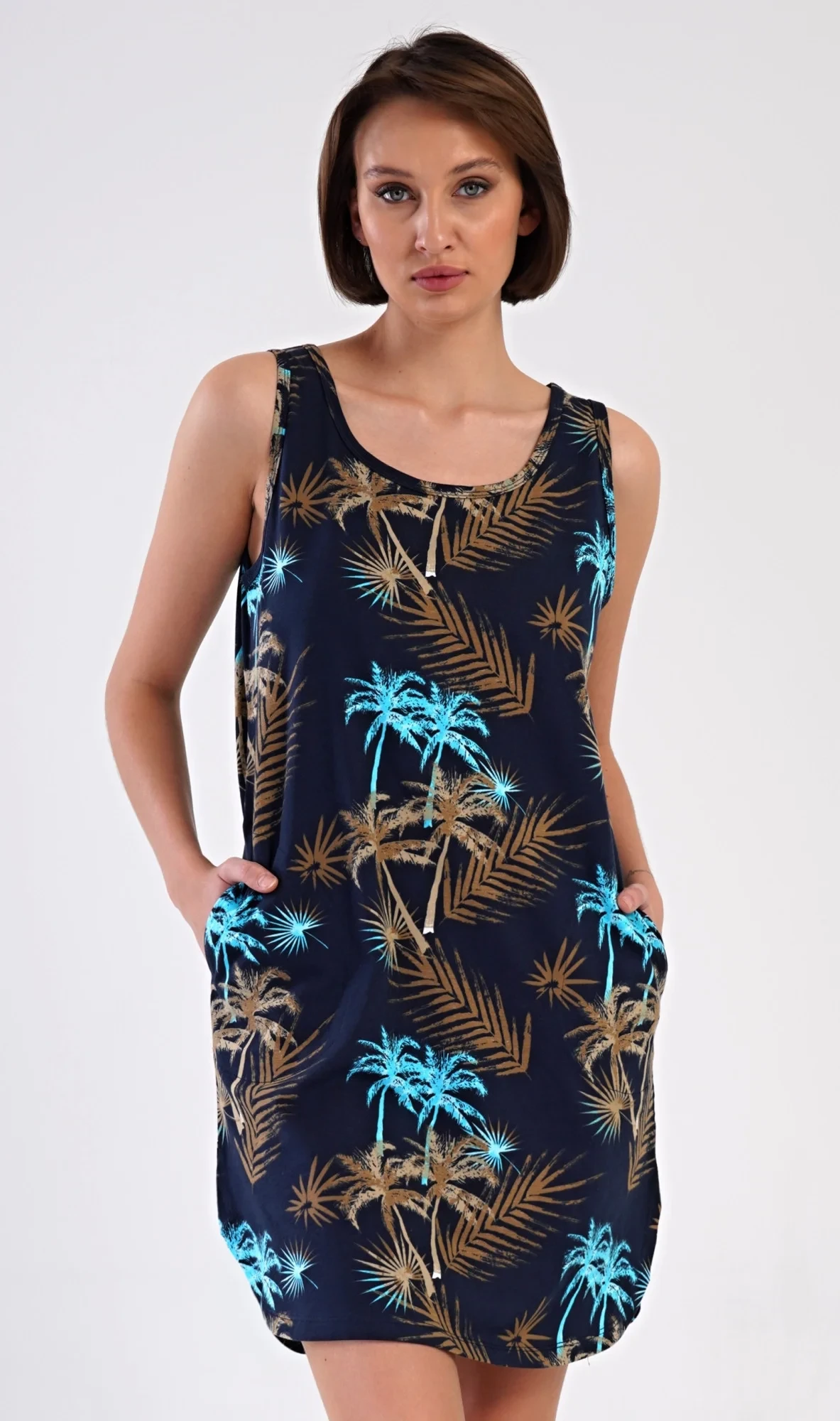 Dámská bavlněná noční košile na ramínka Tropicana. Noční košile se širšími ramínky a kulatým výstřihem má praktické kapsy, je potištěna tropickými palmami. Použitý materiál s obsahem bavlny 100% je příjemný a poddajný na dotek. Košile je vhodná i na denní nošení, obvzlášť ji oceníte v horkých letních dnech.