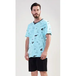 Pánské bavlněné pyžamo šortky Oceán. Pánské pyžamo šortky se skládá z trika s krátkým rukávem a krátkých šortkových kalhot. Tričko je potištěno loďkami, žraloky , palmami a nápisem Big Attack. Pestré tričko vhodně doplňují jednobarevné šortky. Šortky jsou bez kapes, mají gumu a šňůrku na stažení. Použitý materiál s podílem bavlny 100% je příjemný a poddajný na dotek. Pyžamo je vhodné i na denní nošení.