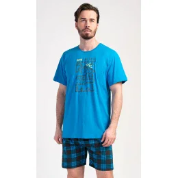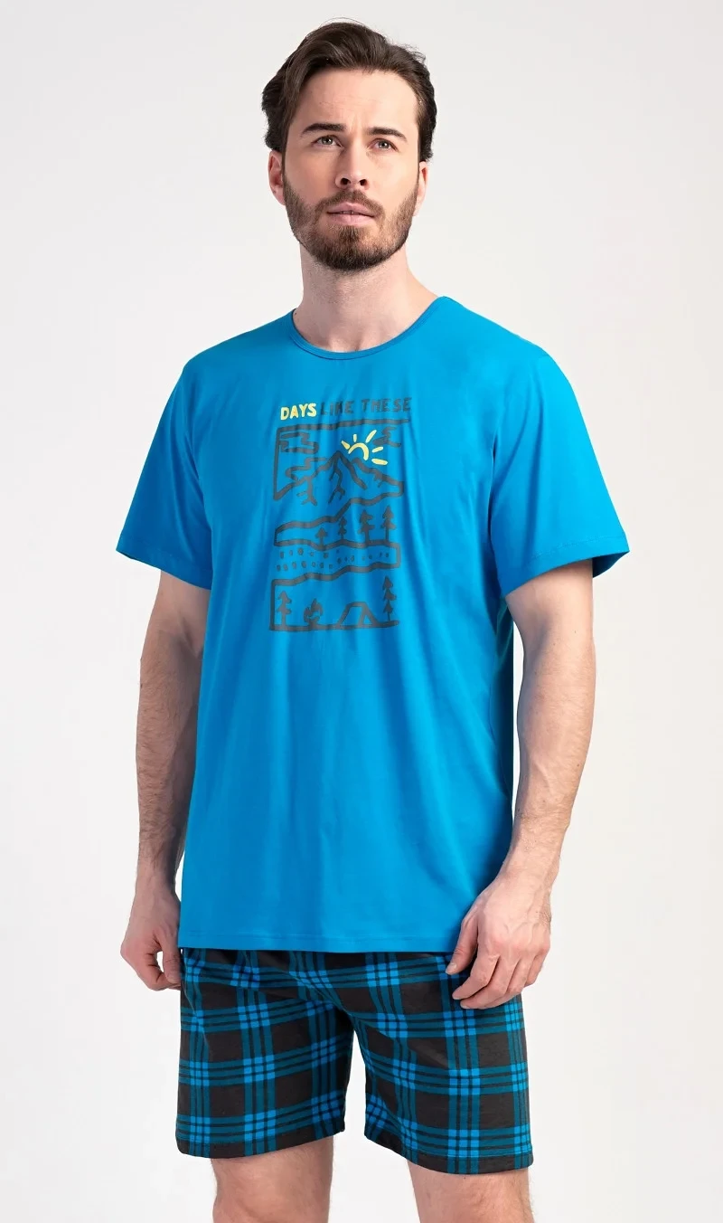 Pánské bavlněné pyžamo šortky Outdoor. Pánské pyžamo se skládá z trička s krátkým rukávem a krátkých šortkových kalhot. Na tričku je obrázek lesnaté krajiny a nápis 'Days like these'. Tričko doplňují kárované šortky, které mají v pase gumu a šňůrku na stažení, nemají kapsy. Použitý materiál s obsahem bavlny 100% je příjemný a poddajný na dotek.