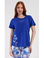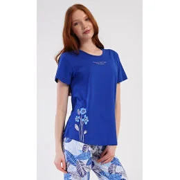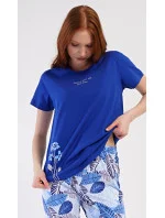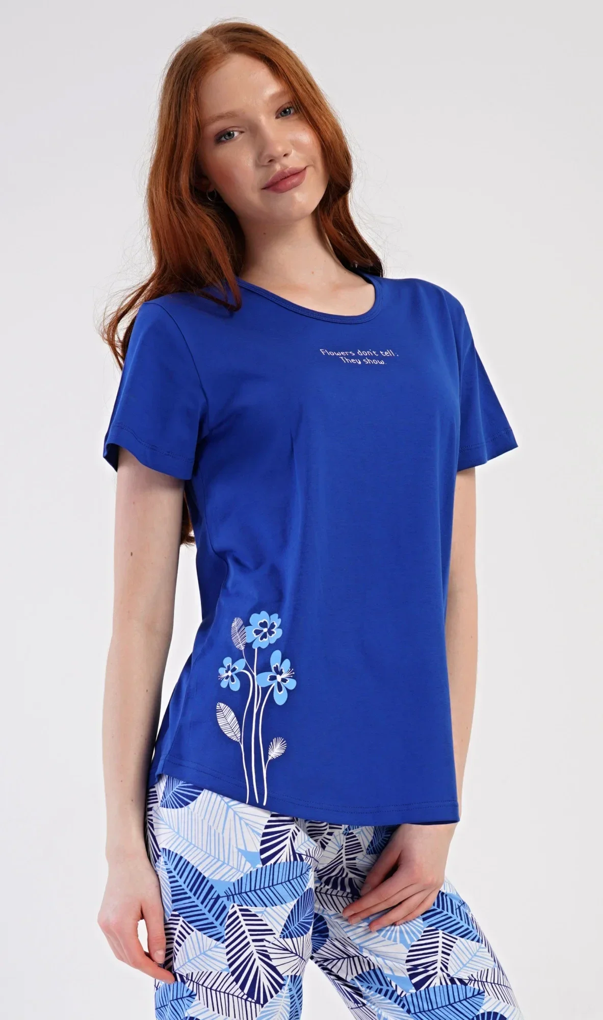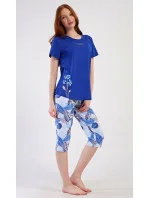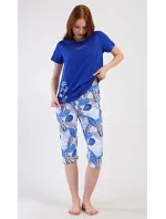 Dámské bavlněné kapri pyžamo Julie. Dámské pyžamo se skládá z trička s krátkým rukávem a tříčtvrtečních kalhot. Tričko s kulatým výstřihem zdobí ve spodní části obrázek květů. Kalhoty s potiskem listů mají v pase gumu a šňůrku na stažení, jsou bez kapes. Použitý bavlněný materiál je příjemný a poddajný na dotek.