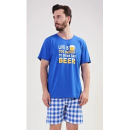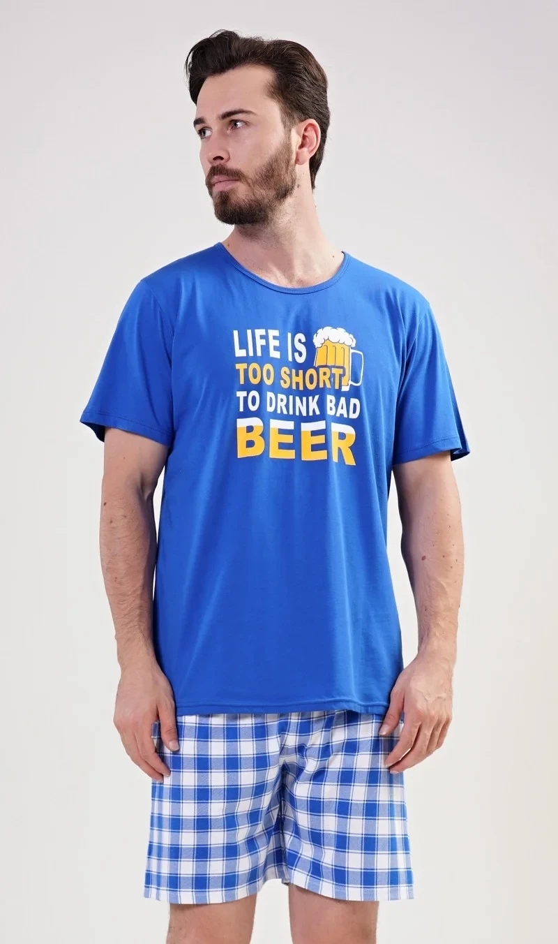 Pánské bavlněné pyžamo šotky Petr. Pánské pyžamo se skládá z trička s krátkým rukávem a krátkých šortkových kalhot. Na tričku je nápis Life is too short to drink bad beer. Výrazné tričko vhodně doplňují kostkované kalhoty. Šortky jsou bez kapes, mají gumu a šňůrku na stažení. Použitý materiál s podílem bavlny 100% je příjemný a poddajný na dotek. Pyžamo je vhodné i na denní nošení.