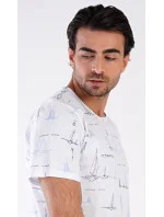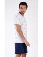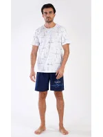 Pánské bavlněné pyžamo šortky Plachetnice. Pánské pyžamo se skládá z trička s krátkým rukávem a krátkých šortkových kalhot. Jednobarevné tričko je potištěno konturami plachetnic. Tričko vhodně doplňují jednobarevné krátké kalhoty, na kterých se opakuje potisk s námořnickým motivem. Šortky mají v pase gumu, šňůrku na stažení, nemají kapsy. Použitý materál s obsahem bavlny 100% je příjemný a poddajný na dotek.