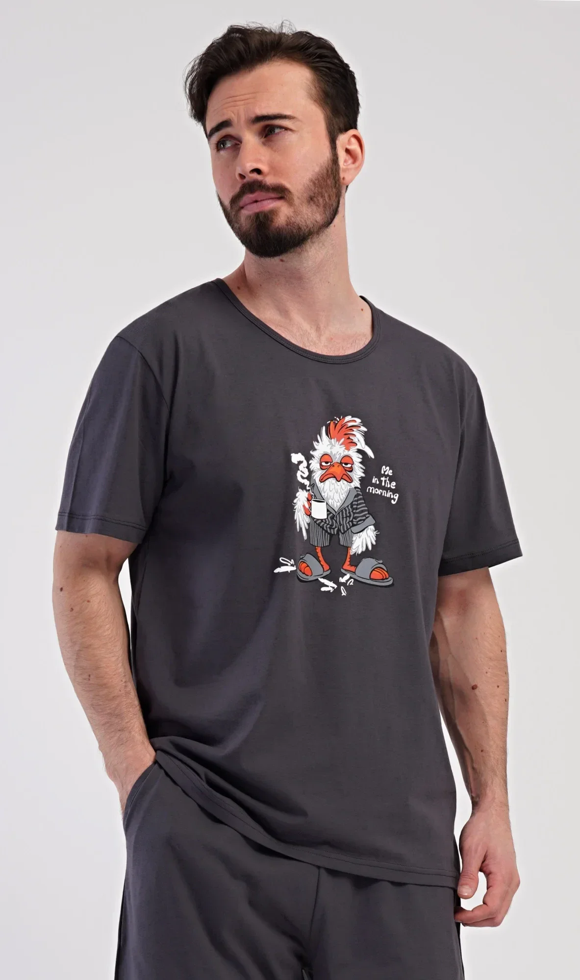 Pánské bavlněné šortkové pyžamo Ranní káva. Pánské pyžamo se skládá z trička s krátkým rukávem a krátkých šortkových kalhot. Na jednobarevném tričku je obrázek rozčepýřeného kohouta, který sije svou ranní kávu. Šortky mají praktické kapsy, v pase gumu a šňůrku na stáhnutí. Použitý materiál s podílem bavlny 100% je příjemný a poddaný na dotek. Pyžamo oceníte obzvlášť v horkých letních dnech.