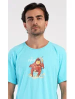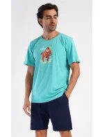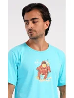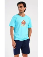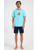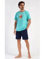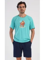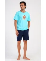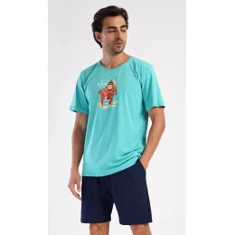 Pánské bavlněné šortkové pyžamo Relax. Pánské pyžamo se skládá z trička s krátkým rukávem a krátkých šortkových kalhot. Na jednobarevném tričku je obrázek opičáka, který relaxuje na pláži s drinkem. Šortky mají praktické kapsy, v pase gumu a šňůrku na stáhnutí. Použitý materiál s podílem bavlny 100% je příjemný a poddaný na dotek. Pyžamo je vhodné i na denní nošení a oceníte ho obzvlášť v horkých letních dnech.