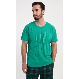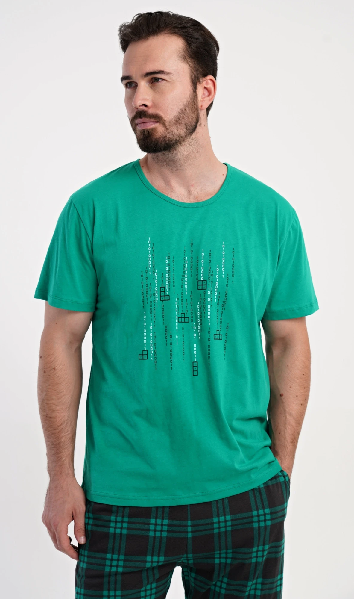 Pánské bavlněné šortkové pyžamo Tetris. Pánské pyžamo se skládá z trička s krátkým rukávem a krátkých šortkových kalhot. Tričko s kulatým výstřihem zdobí na hrudi obrázek hry Tetris. Tričko doplňují kárované šortky, které mají v pase gumu, šňůrku na stažení a praktické kapsy. Použitý materiál s obsahem bavlny 100% je příjemný a poddajný na dotek.