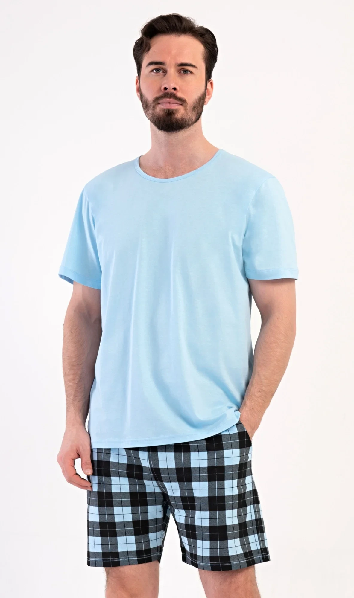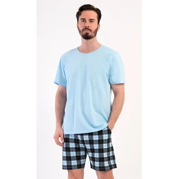 Pánské bavlněné šortkové pyžamo Vašek. Pánské pyžamo se skládá z trička s krátkým rukávem a krátkých šortkových kalhot. Jednobarevné tričko má kulatý výstřih a je vhodné pro všechny milovníky pohodlné módy bez potisku. Tričko doplňují kárované šortky, které mají v pase gumu, šňůrku na stažení a praktické kapsy. Použitý materiál s obsahem bavlny 100% je příjemný a poddajný na dotek.