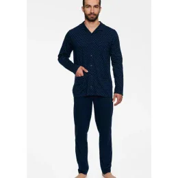 Pánské rozepínací pyžamo od značky Henderson, které je vyrobené z velmi kvalitní bavlny. Vzorovaný vrchní díl pyžama má límeček, kapsy a zapíná se knoflíky. Komplet doplňují dlouhé jednobarevné kalhoty bez úpletů.
