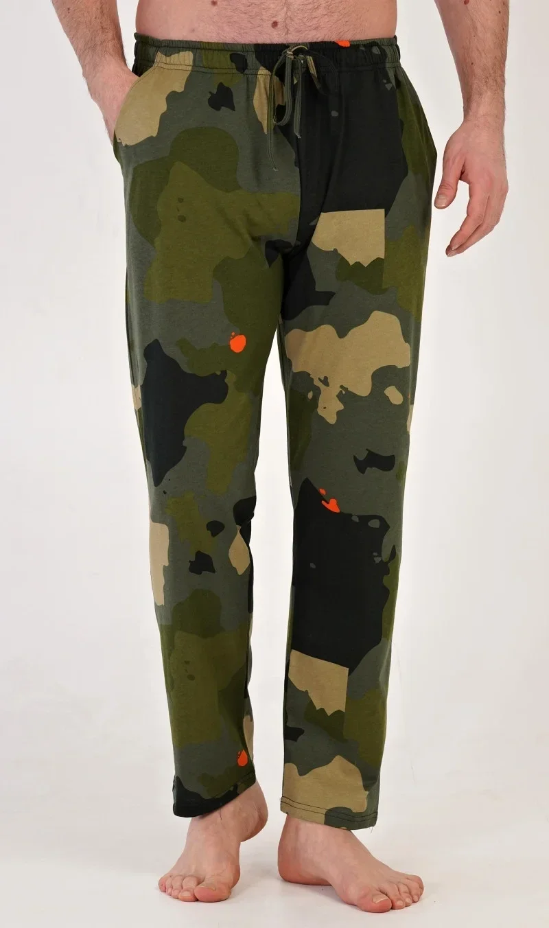 Pánské bavlněné pyžamové kalhoty Marek. Pyžamové kalhoty kalhoty mají v pase gumu, šňůrku na stažení a praktické kapsy. Jsou vhodné i na denní nošení jako domácí kalhoty. Mateiriál s army potiskem a podílem bavlny 100% je příjemný a poddajný na dotek.