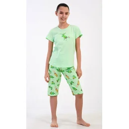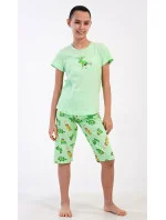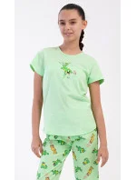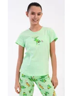 Dětské bavlněné pyžamo kapri Ella. Dětské pyžamo se skládá z trička s krátkým rukávem a tříčtvrtečních kalhot. Na jednobarevném tričku je obrázek veselé ještěrky. Tento motiv se opakuje i na kalhotách, které mají délku pod kolena. Použitý bavlněný materiál je příjemný a poddajný na dotek.