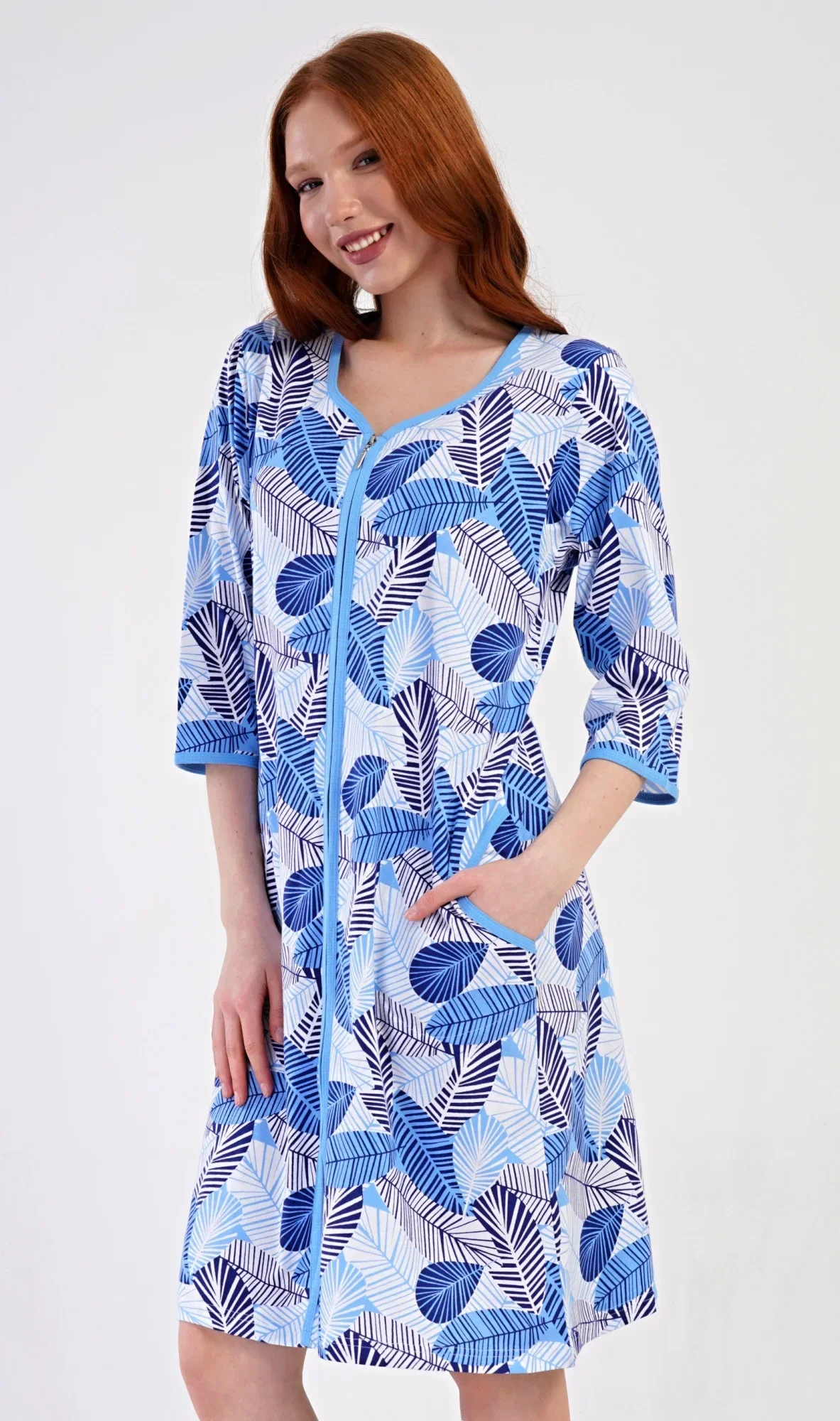 Dámské bavlněné domácí šaty s tříčtvrtečním rukávem Julie. Pohodlné rozepínací šaty v příjemné délce pod kolena využijete téměř při všech volnočasových aktivitách. Mají praktické kapsy a zapínání na zip. Šaty jsou potištěny listy. Použitý bavlněný materiál je příjemný a poddajný na dotek.