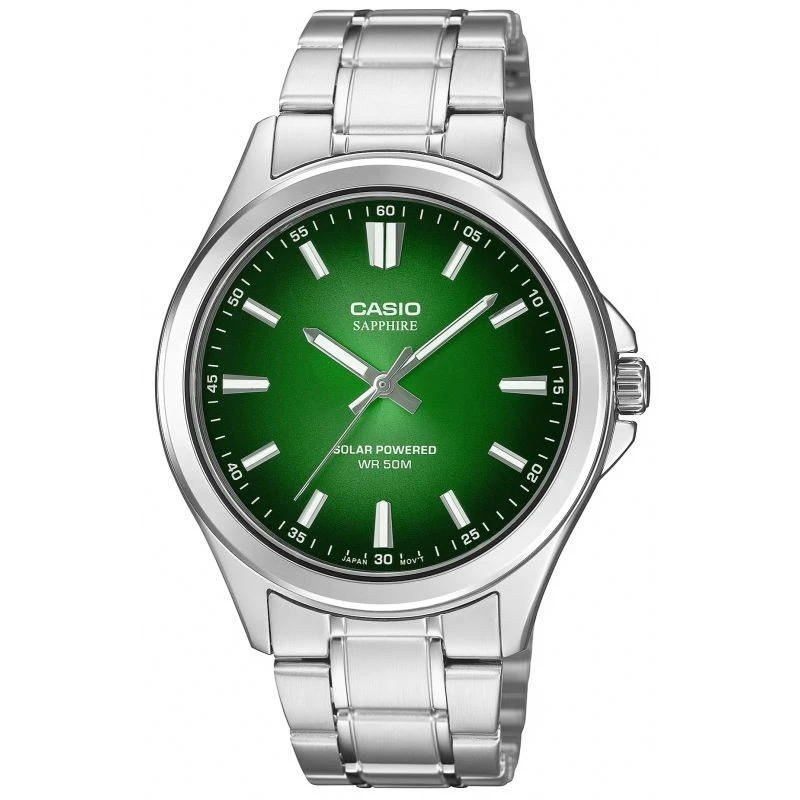Využijte sílu slunce s analogovými hodinkami CASIO Solar! Díky solárnímu napájení se nemusíte starat o baterie - solární panel nabíjí hodinky světlem, které jim na plné nabití zajistí až 4 měsíce provozu. Smaragdově zelený odstín ciferníku se v závislosti na úhlu dopadu světla jemně mění - od sytě tmavě zelené až po jasnější, téměř neonovou záři. Tato zelená varianta je velmi výrazná a stylová, zejména v kombinaci s pouzdrem a náramkem stříbrné barvy. Safírové sklíčko s antireflexní vrstvou nejen chrání před poškrábáním, ale také zvýrazňuje hloubku barvy ciferníku a zachovává jeho čitelnost i při ostrém světle. Vodotěsnost 50 metrů poskytuje ochranu při každodenním používání - žádné obavy ze styku s vodou, deště nebo mytí rukou.