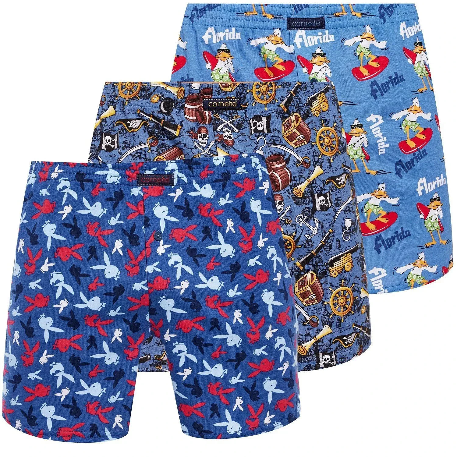 Pánské trenýrky 3 pack Classic mix2 CORNETTE - z vysoce jakostní bavlny - se zábavným motivem - volný střih modelu je zárukou pohodlí, které potřebuje a ocení každý muž - pohodlná guma v pase je obšitá bavlnou - rozparek se zapíná na knoflíček - 3 kusy v balení