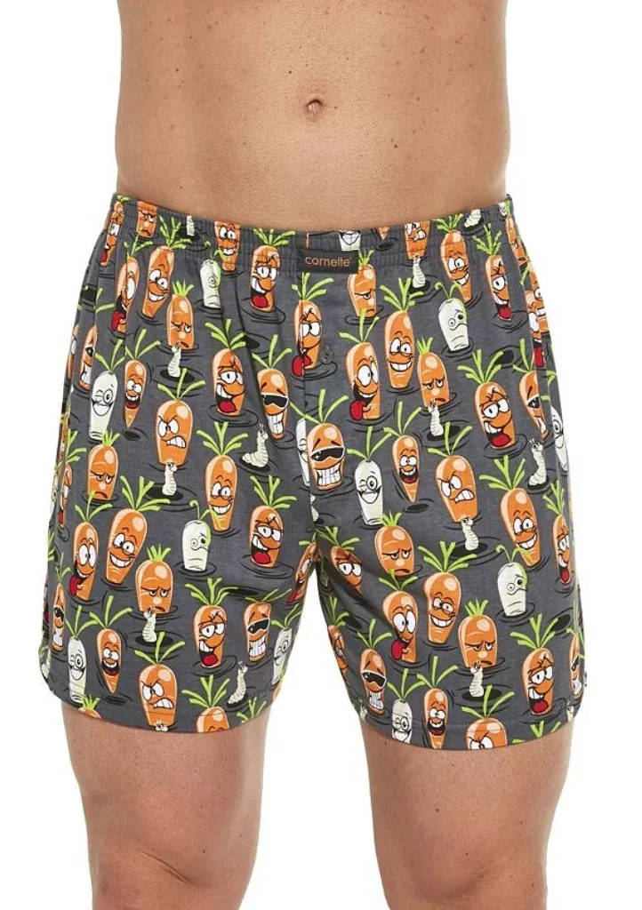 Bavlněné volné trenýrky s vtipným motivem od značky Cornette. Trenýrky mají obšitou gumu s nášivkou Cornette na přední části a propínání na knoflíček.