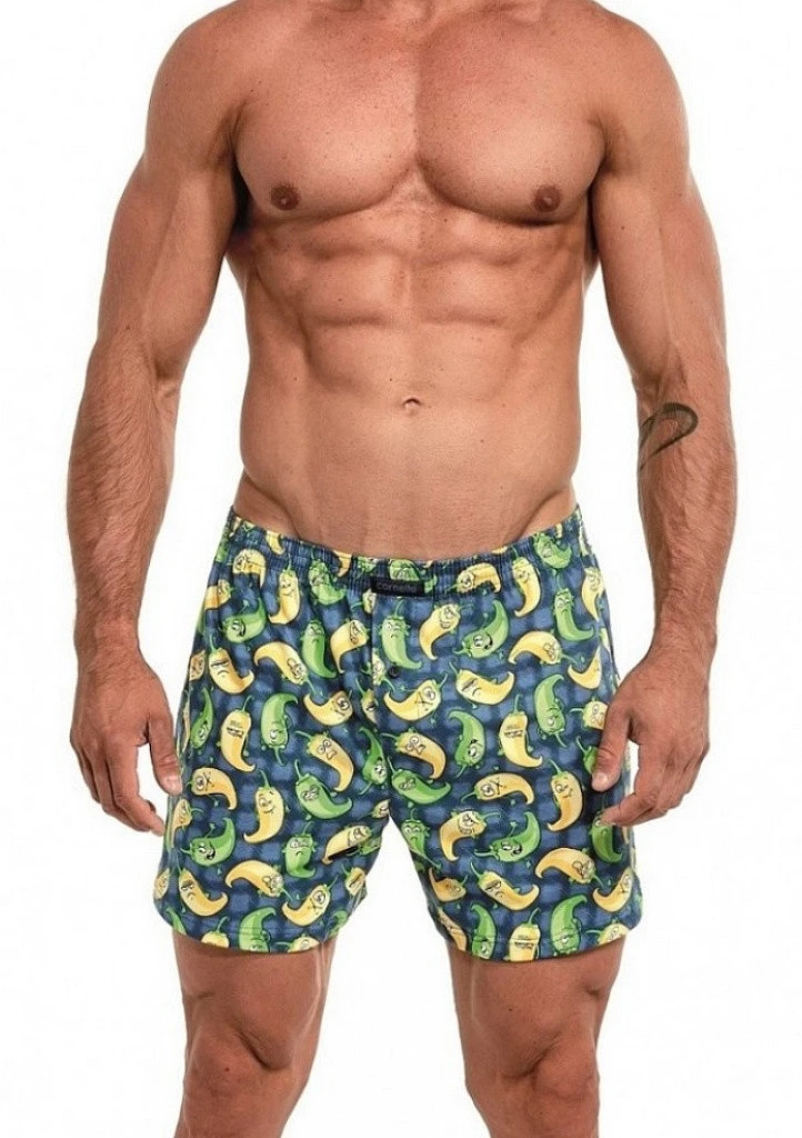 Bavlněné volné trenýrky s veselým motivem od značky Cornette. Trenýrky mají obšitou gumu s nášivkou Cornette na přední části a propínání na knoflíček.