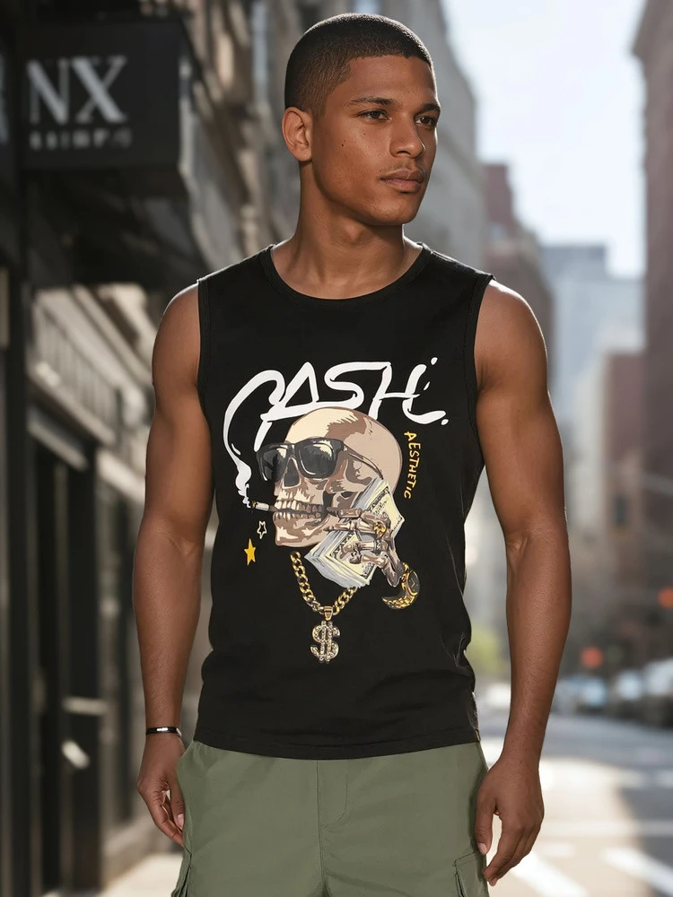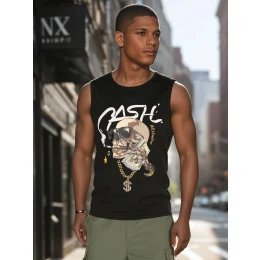 Tričko bez rukávů s městským potiskem je tou správnou volbou pro muže, kteří hledají výrazný akcent ke svému letnímu outfitu. Výstřih, klasický střih a výrazný potisk s motivem lebky a nápisem "CASH" dodávají tričku módní a mladistvý nádech. Skvěle se hodí na jarní a letní procházky městem.