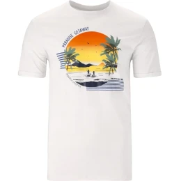 Dominantním prvkem je barevný potisk na hrudi s motivem západu slunce, palem a paddleboardistů, doplněný texty „PARADISE GETAWAY“, „PEACEFUL LIFESTYLE“ a „TRAVEL BY SEA“. Tento design navozuje atmosféru klidu, dobrodružství a letního volného času.
