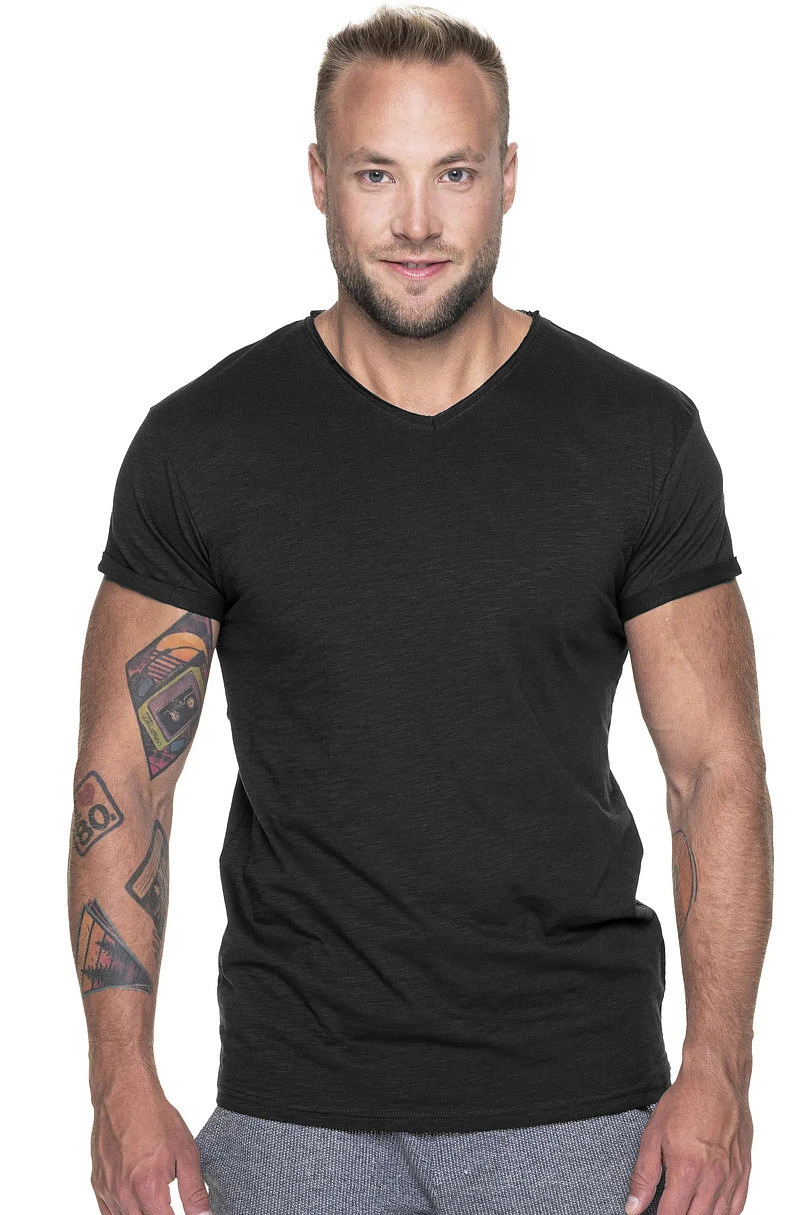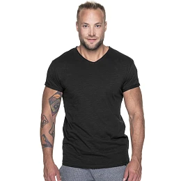 Pánské tričko z organické bavlny s véčkovým výstřihem. Materiál je měkký typu single jersey. Rukávy jsou trojtě ohrnuté. Na krku a na ramenou jsou zpevněné švy.