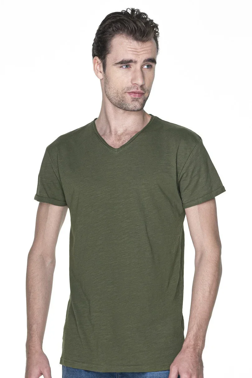 Męski t-shirt z dekoltem typu v-neck z bawełny organicznej. Miękki i przyjemny materiał single jersey typu slub. Surowe wykończenie dekoltu, potrójnie wywinięty i przeszyty brzeg rękawka, taśma wzmacniająca typu twill na karku, taśma wzmacniająca na ramionach, podwójny dolny szew. Skład: 100% bawełna półczesana, gramatura: 150g/m2