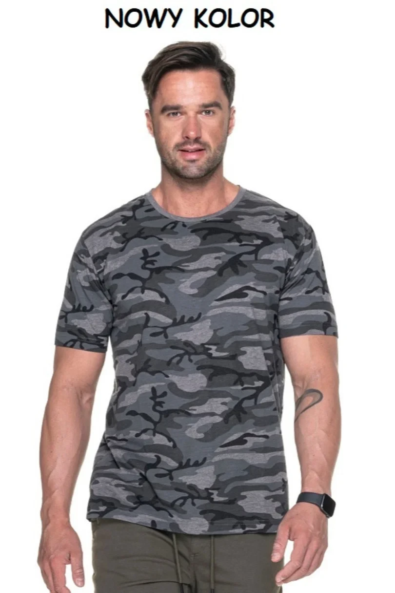 Tričko je měkké a je vyrobené z hladkého materiálu single žerzej. Model zdobí maskáčový potisk moro. Výstřih lemuje pružný stahovací lem. Na ramenou je zpevňující páska. Model má dvojité švy.