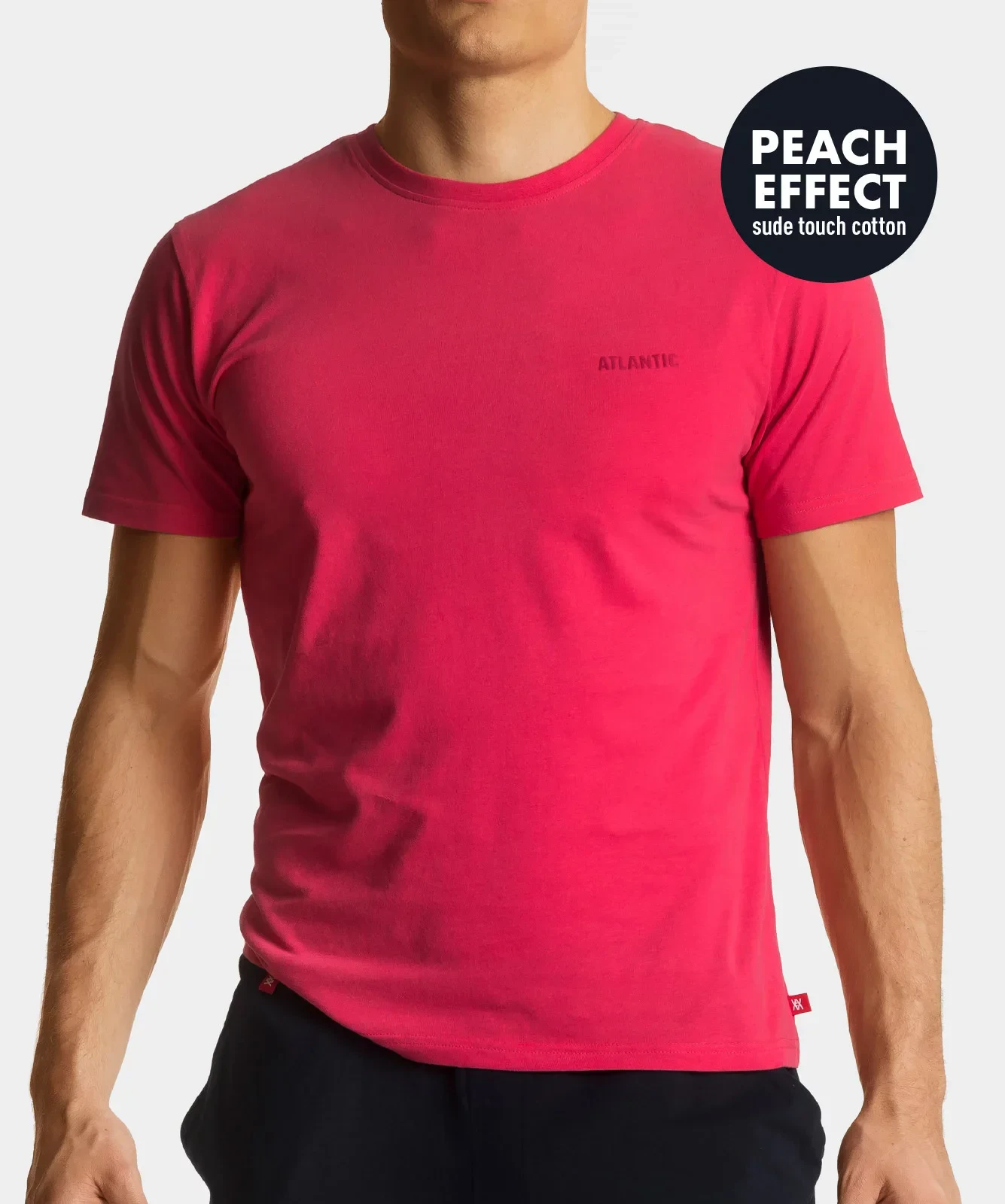 Tričko s krátkým rukávem má vyvýšený kulatý výstřih. Je vyrobeno z nejkvalitnější bavlny, podrobená procesu "česání". Dodatečně mají úplety tzv "Peach effect", což znamená, že působí jako "semišová" broskvová kůže.