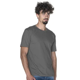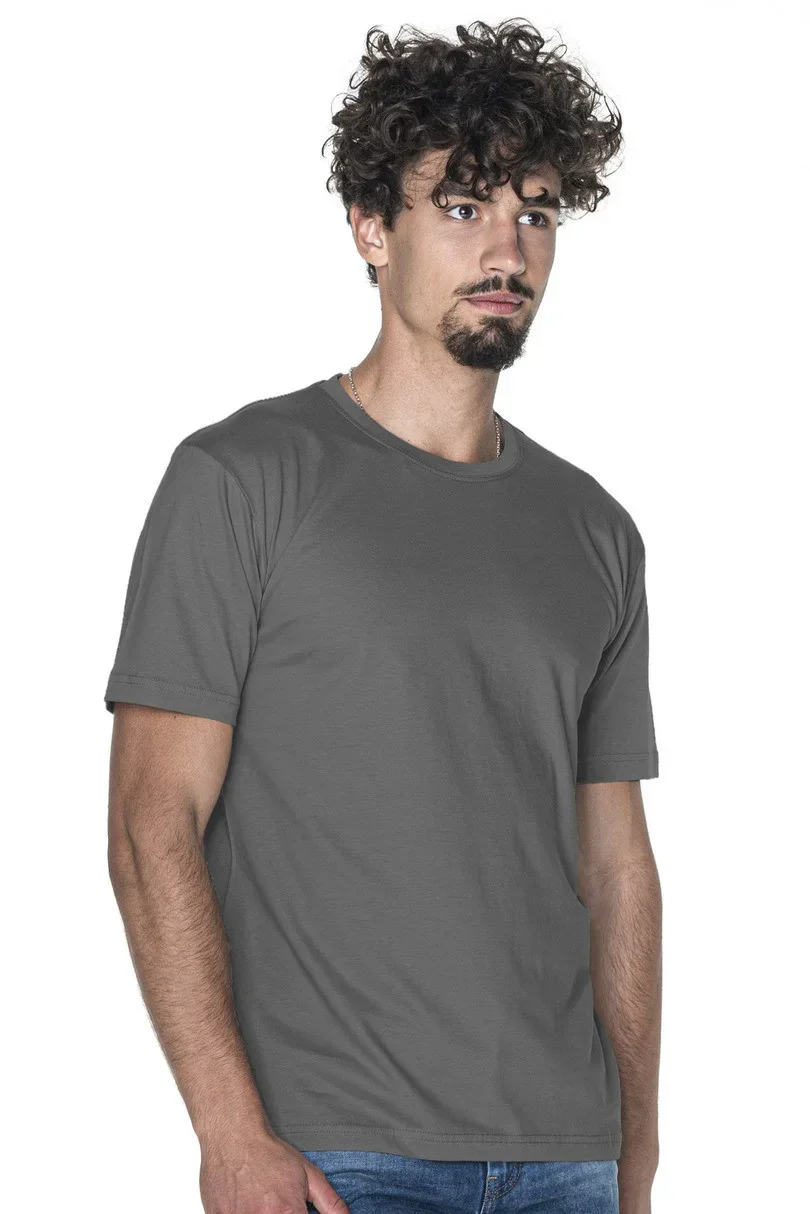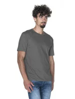 Tričko je vyrobené z tkaniny "single jersey". Model má klasický střih a je ušitý z materiálu, který byl speciálně upravený (enzymaticky vypraný), a proto je krásně rovný a zbavený všech nerovností. Díky silikonové úpravě je materiál měkký a příjemný na dotyk. Výstřih je olemovaný dvouvrstvým lemem s elastanem. Kolem krku a na ramenou je zpevňující a stabilizující páska, která pozitivně ovlivňuje odolnost a životnost švů. Boky trička jsou bezešvé. Díky tomu je tričko pohodlnější a je možné jej potisknout. Husté dvojité švy jsou provedené nejkvalitnější nití.
