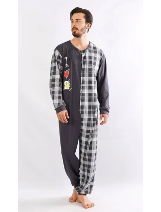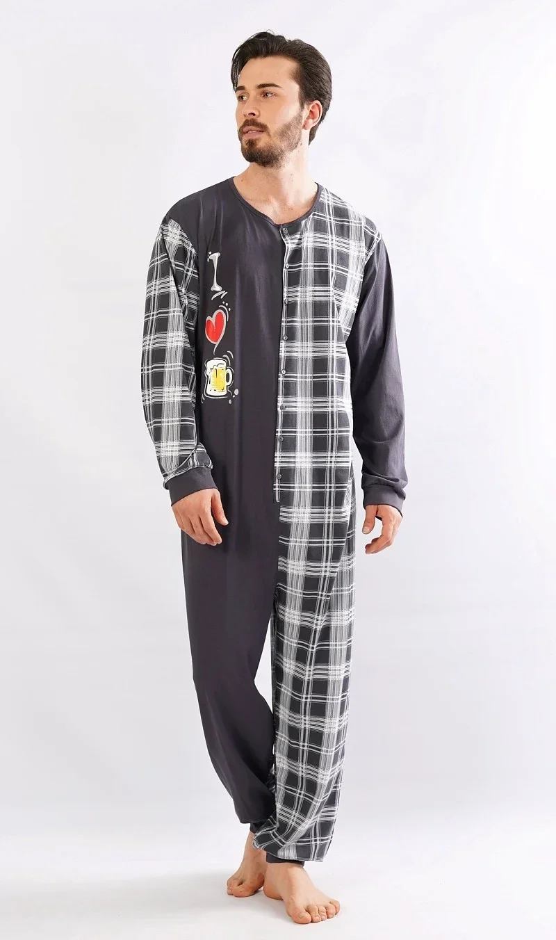 Pánský bavlněný overal I love Beer. Celopropínací overal zaručuje pohodlné spaní, rukávy a nohavice jsou zakončeny elastickým lemem. Overal se pohledově skládá ze dvou polovin - jednobarevné, která je doplněna veselým potiskem, druhá polovina je potištěna károu, z káry je i zadní díl. Použitý bavlněný materiál je příjemný a poddajný na dotek.