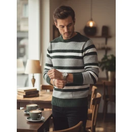 Tento klasický pánský pruhovaný svetr je nezbytným doplňkem pro chladnější dny. Je vyroben z příjemného materiálu a poskytuje pohodlí a teplo po celý den. Díky stylové barevné kombinaci se svetr skvěle hodí k různým outfitům - od ležérních až po elegantnější. Je mimořádně měkký na dotek, ideální pro každodenní nošení, do práce nebo na setkání s přáteli a hodí se k džínám i chinos kalhotám, čímž působí jedinečně.
