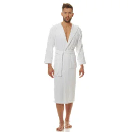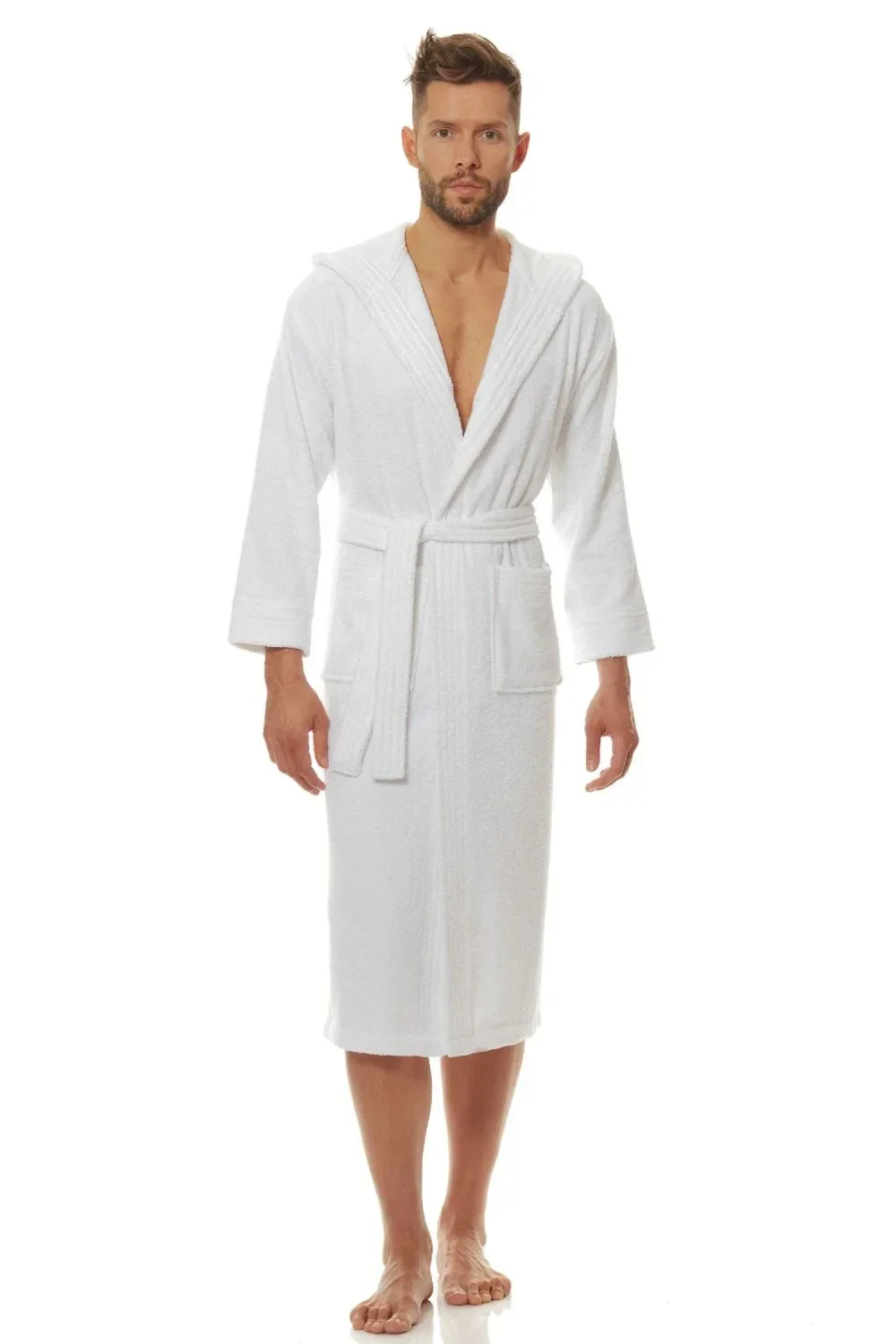 Pánský župan klasického střihu 2104 L&L - z měkké a příjemné bavlny - na hrudi má malou nášivku - bez zapínání, zavazuje se v pase páskem - na bocích našité kapsy - s kapucí