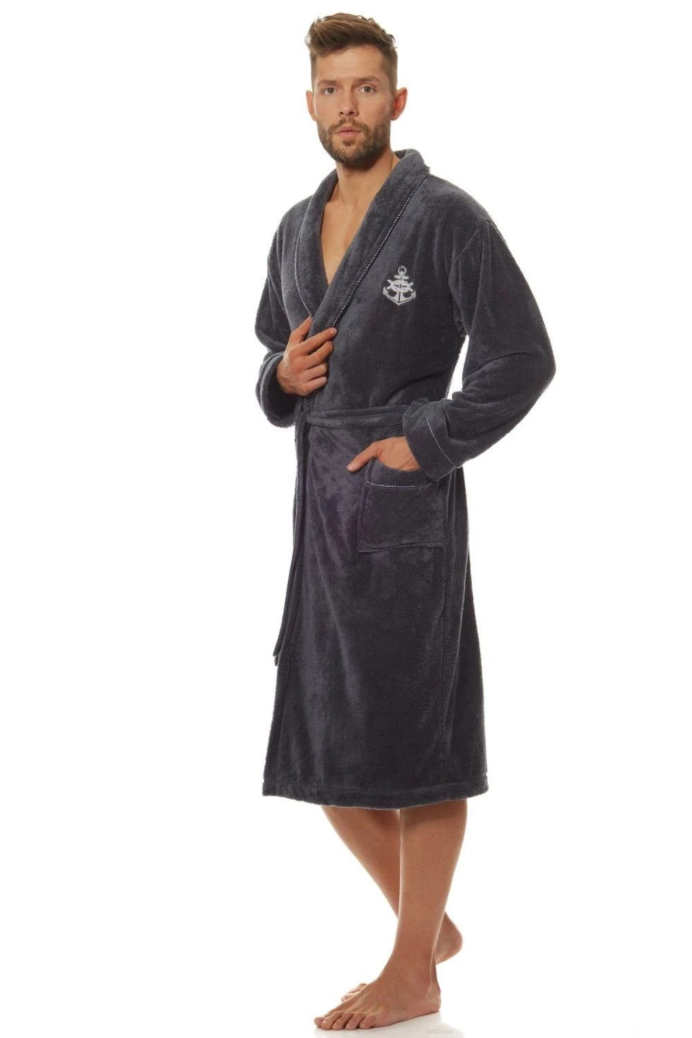 Pánský župan klasického střihu 2114 Marine L&L - z měkké tkaniny velmi příjemné na dotyk - v grafitové barvě - na hrudi má malou nášivku - zavazuje se v pase páskem - na bocích jsou našité kapsy - s šálovým límcem