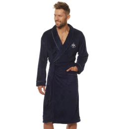 Pánský župan s šálovým límcem z měkkého úpletu, zavazování v pase, kapsy na úrovni boků.