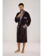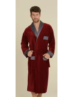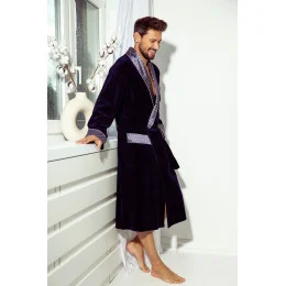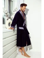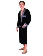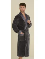 Pánský velurový župan s límcem, v Podvazkový páse na zavázání a dvěma našitými kapsami na bocích a jednou na hrudi. Manžety, límec a kapsy jsou zakončené vzorovaným saténem.